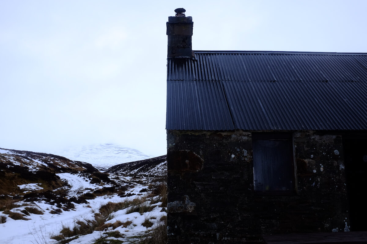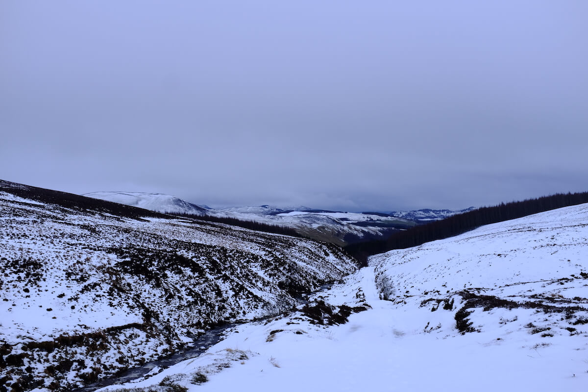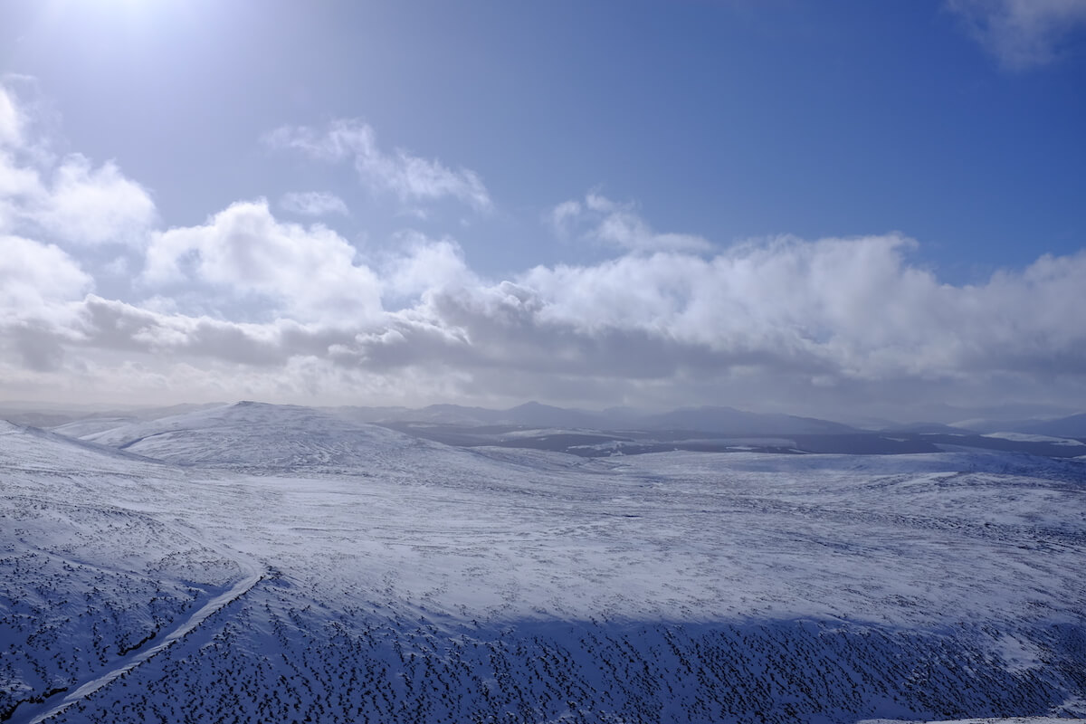 It starts snowing, and we’re glad not to be on the munro top right now.