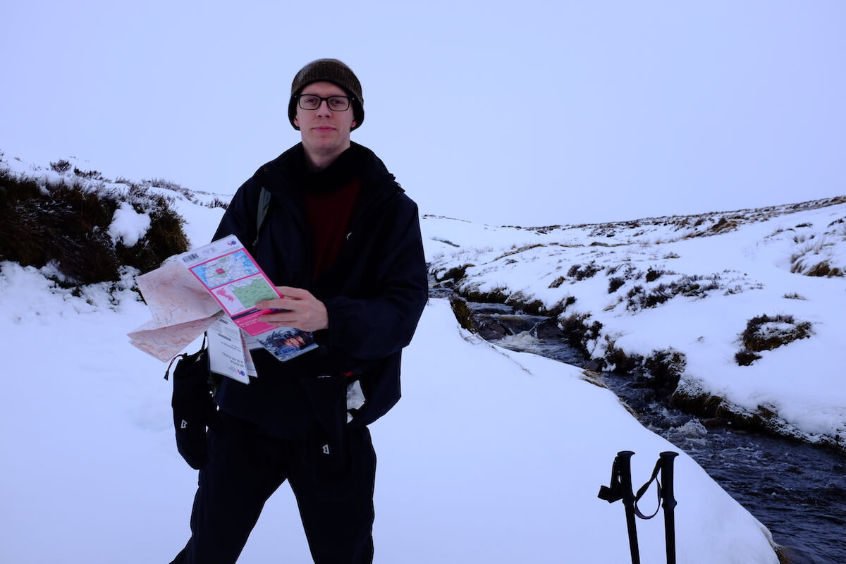 Soon, we’re out of the forest, and around 6:30 we no longer need the lamps. It’s muddy and slippery, we stabilise our steps with trekking poles. We are on the wrong side of a long fence, so we have to take a long detour, but eventually we find a spot where we can climb over. Mud turns into slush, slush turns into snow. Our path leads through a ford, but we decide not to risk it, and stay on this side of the brook — the footpath will cross back again in a kilometre or so.