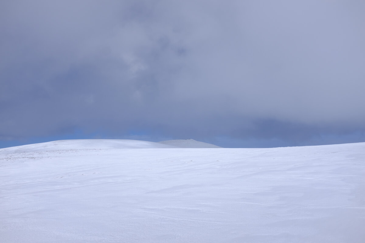 We reach the bottom of the munro in about 45 minutes, and begin the climb, following some cramponed footsteps that disappear after a while. We don’t have crampons, but it’s all right, the climb is not too steep, we have trekking poles, and the snow is very sticky (so sticky in fact that we can’t practice ice axe self-arrest). Tailwind helps too, and the slope eases into an almost even terrain after half an hour or so.