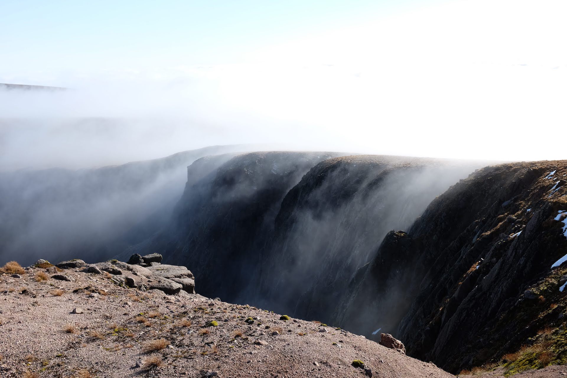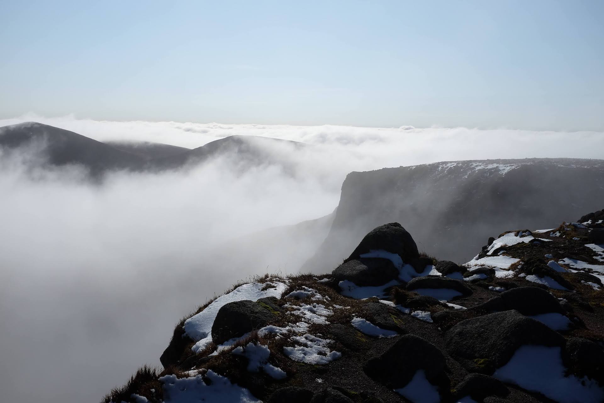 We wanted to hike the vast plateau in the hearth of the Cairngorms, a rocky tundra that towers above a massive valley, Lairig Ghru. Extremely exposed to bad weather and traversing fields of boulders, the terrain is very arduous to walk on.