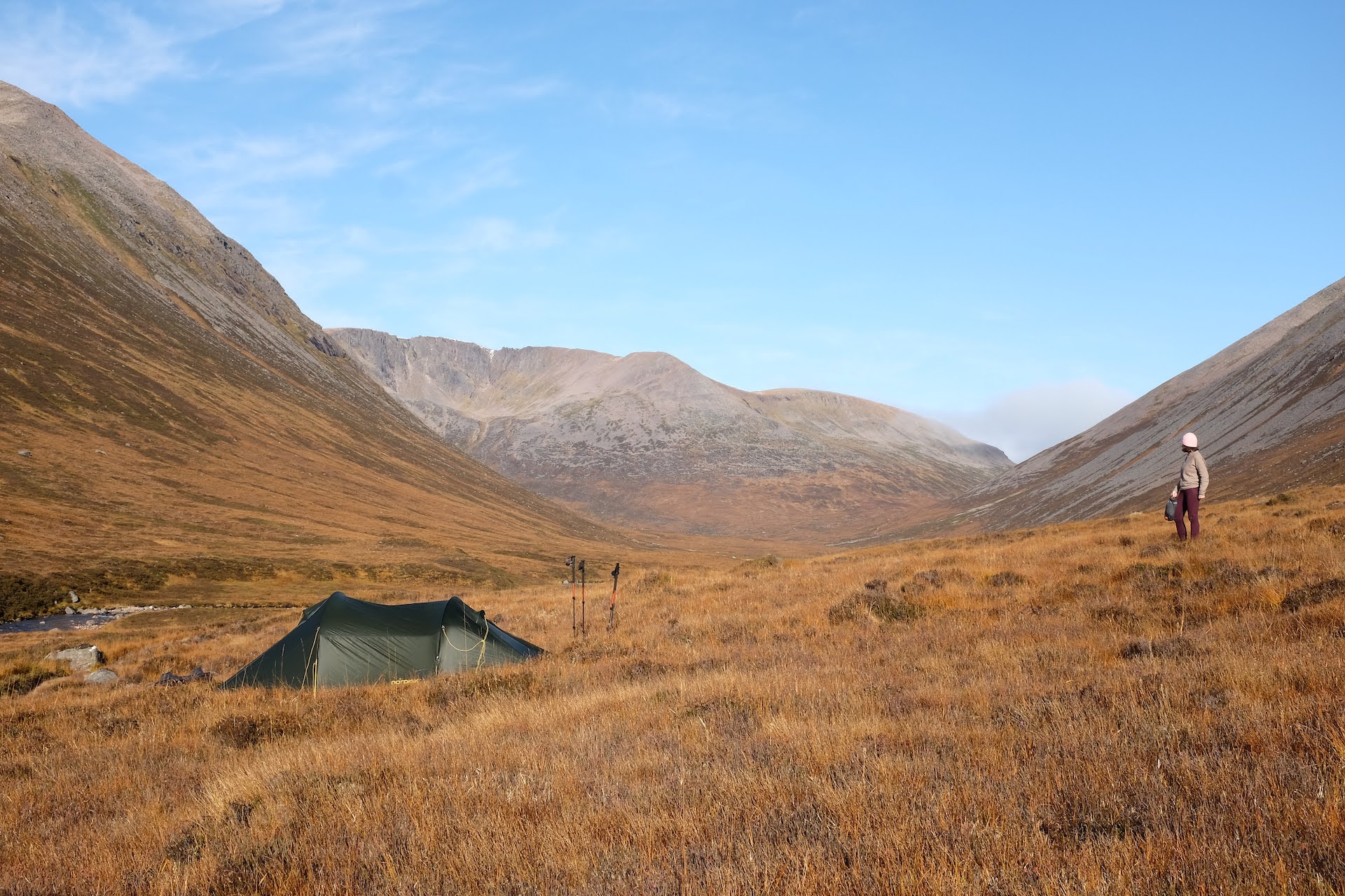 After descending into the valley, we had a peaceful night in our tent and rose to a gorgeous sunny day — off we went for miles and miles through the Lairig Ghru, back to Aviemore, where we had started.