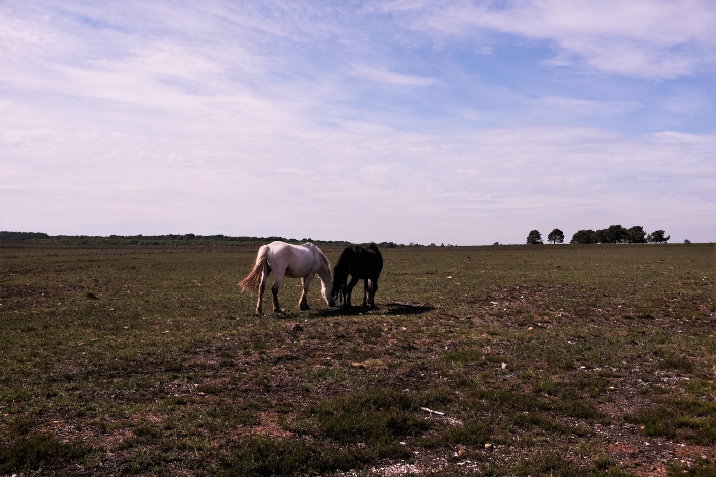 The horses are used to humans, but keep their distance. They are New Forest ponies by breed, and have their respective owners, but are free to roam most of the year.